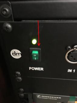 To turn on the hall sound system open the left most cabinet on the dias and press the green master switch labelled power (next to the DM logo).