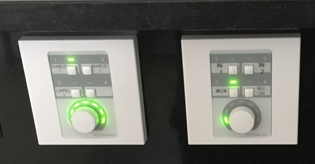 The system volumes, etc can be controlled from either the control panel in the dias cupboard or the one to the right of the west door.